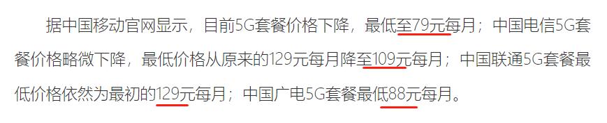 巧合的是,中国新闻网和大忽悠想到了一起。上个月中新网发布了一则消息,关于目前三大运营商官网的5G套餐资费。根据该消息,移动的最低月租为79元,电信为109元,联通为129元,广电为88元。当然,中新网还提到了资费已经通过合约折扣的方式实现了“暗降”。