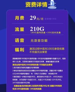 无语音功能的29元套餐,包含180G的通用流量和30G的定向流量。这个套餐适用于那些更注重数据使用而不太需要语音通话的用户。无论是在日常生活中还是在工作中,这个套餐都能满足用户对大量数据流量的需求。无论是浏览网页、使用社交媒体、观看视频还是下载文件,用户都可以尽情地享受高速的网络体验。此外,30G的定向流量还可以用于特定的应用或网站,让用户更加灵活地使用流量。总的来说,这个29元套餐提供了大量的数据流量,适合那些对语音通话需求不高的用户。