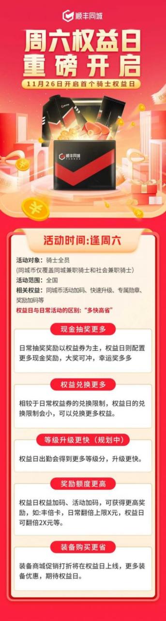 从11月26日起,顺丰将为骑士开展骑士权益日福利活动。该活动将每周的周六设定为权益日,骑士参加活动可享受同城币活动加码、快速升级、专属奖章、奖励加码等权益日的专属福利。